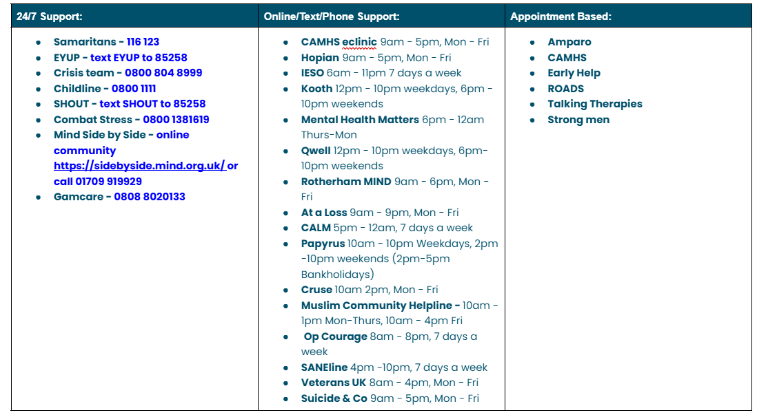 Healthwatch Rotherham have created the below list of mental health services available both in Rotherham and across the country. We believe in the importance of making Rotherham residents aware of the services available to them and how to access them, ensuring people know there is help and support out there if they should need it. We have grouped the services into local and national categories, and have tried to include contact details where possible. Please follow the website links which will direct you to the service website, where you can find more information and resources. If you have any questions, please contact us.